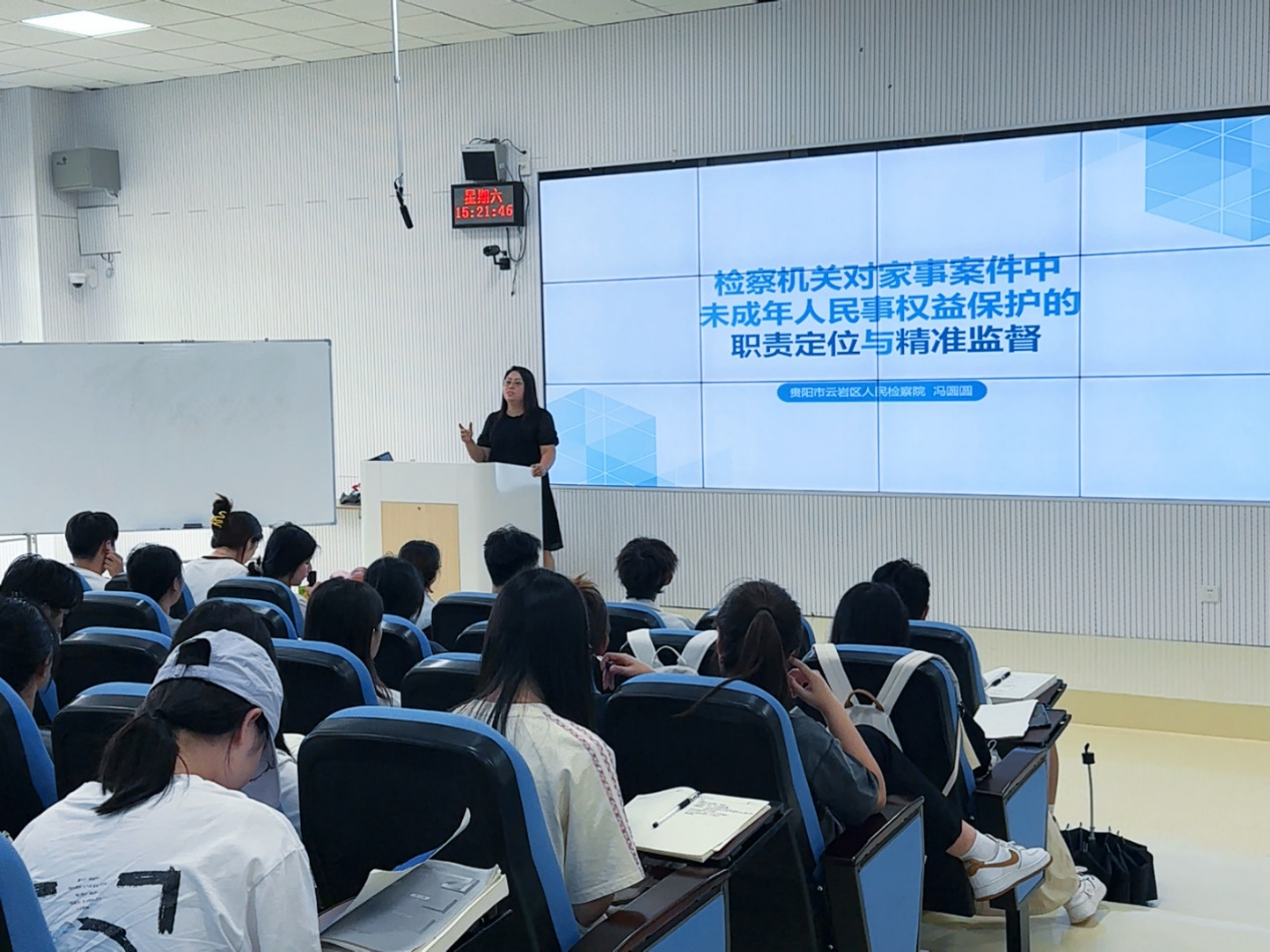 (法学院 王紫微 刘媛 图文报道)9月9日下午,开云网页版登录入口“三大论坛”之人文论坛、贵州省人民检察院“检察实务专家进校园”系列课程第二讲在乐学楼成功举办。本次讲座特邀贵阳市云岩区人民检察院检委会专职委员、一级检察官冯圆圆,以“检察机关对家事案件中未成年人民事权益保护的职责定位与精准监督”为主题进行授课,法学院副院长宋昭澜主持讲座,百余名师生到场聆听、交流。